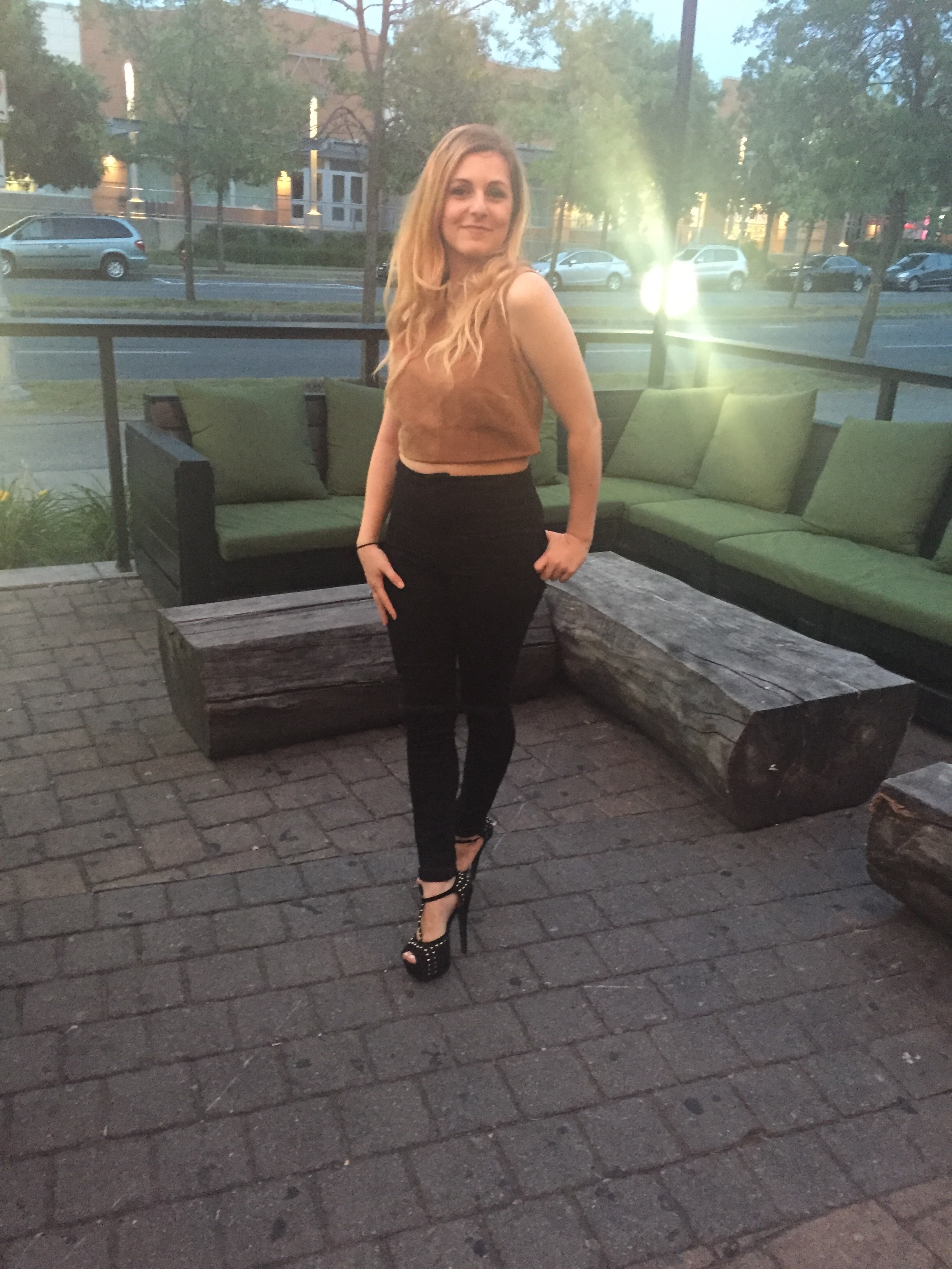 Camel faux-suede crop top and black high waist jeans from Forever 21.