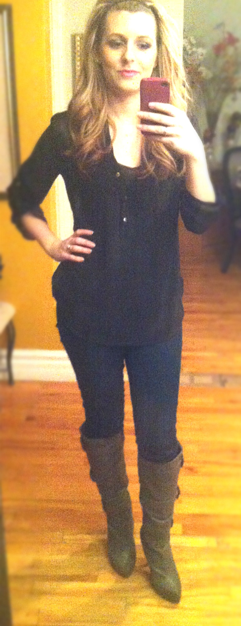 She’s wearing a taupe with some thin brown thread sweater-like shirt, very comfy and simple. It’s from Winners